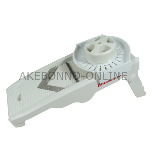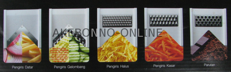 Slicer atau pemotong buah dan sayur dengan mata pisau berbentuk V sehingga hasil potongan akan lebih halus karena memotong dari 2 sisi. mata pisau dapat diganti-ganti, tersedia 5 macam mata pisau, pisau potong datar, pisau potong gelombang,parutan, pengiris halus dan pengiris kasar, Dilengkapi juga dengan pisau vertikal untuk irisan persegi. ketebalan potongan dapat diatur dengan memutar knob disamping alat. Body terbuat dari plastik ABS, kuat dan lebih tahan benturan, pisau dari baja dan dilengkapi container untuk tempat pisau.